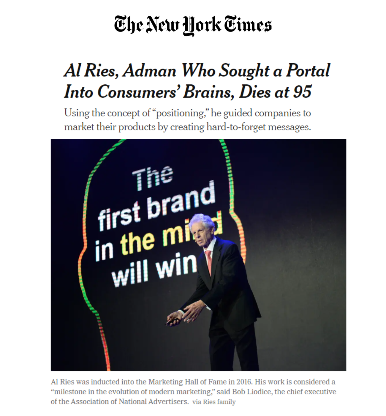New York Times, Al Ries, Adman Who Sought a Portal Into Consumer's Brains, Dies at 95 AdAge, Father of Positioning, Dies at Age 95 AJC, Al Ries, changed the world of advertising, dies at 95 Media contact: Laura Ries - laura@ries.com Al Ries, the guy that owned the position on “positioning.”